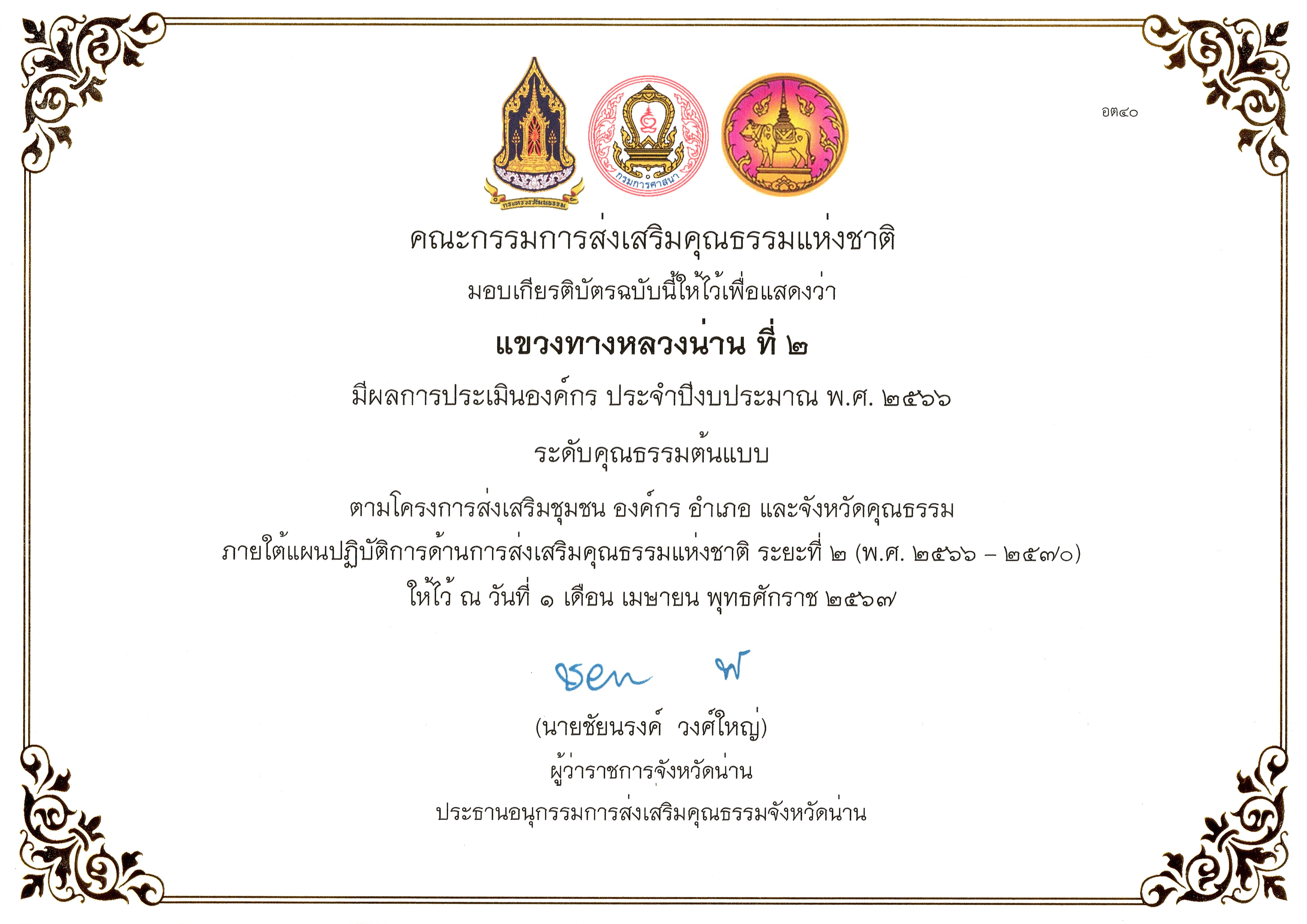 นายอภิชาติ ชาญธัญกร ผู้อำนวนการแขวงทางหลวงน่านที่ 2 มอบหมายให้นางสุดธิดา สินธุ์ชัย เจ้าพนักงานธุรการชำนาญงาน เป็นตัวแทนรับมอบเกียรติบัตร จากคณะกรรมการส่งเสริมคุณธรรมแห่งชาติ เพื่อแสดงว่า แขวงทางหลวงน่านที่ 2 มีผลการประเมิณองค์กร ประจำปีงบประมาณ พ.ศ.2566 ระดับคุณธรรมต้นแบบ ตามโครงการส่งเสริมชุมชน องค์กร อำเภอ และจังหวัดคุณธรรม โดยมีนายกฤชดพชร เพชระบูรณิน รองผู้ว่าราชการจังหวัดน่าน เป็นประธานในพิธี ณ โรงแรมน่านตรึงใจ บูทีค อำเภอเมืองน่าน จังหวัดน่าน